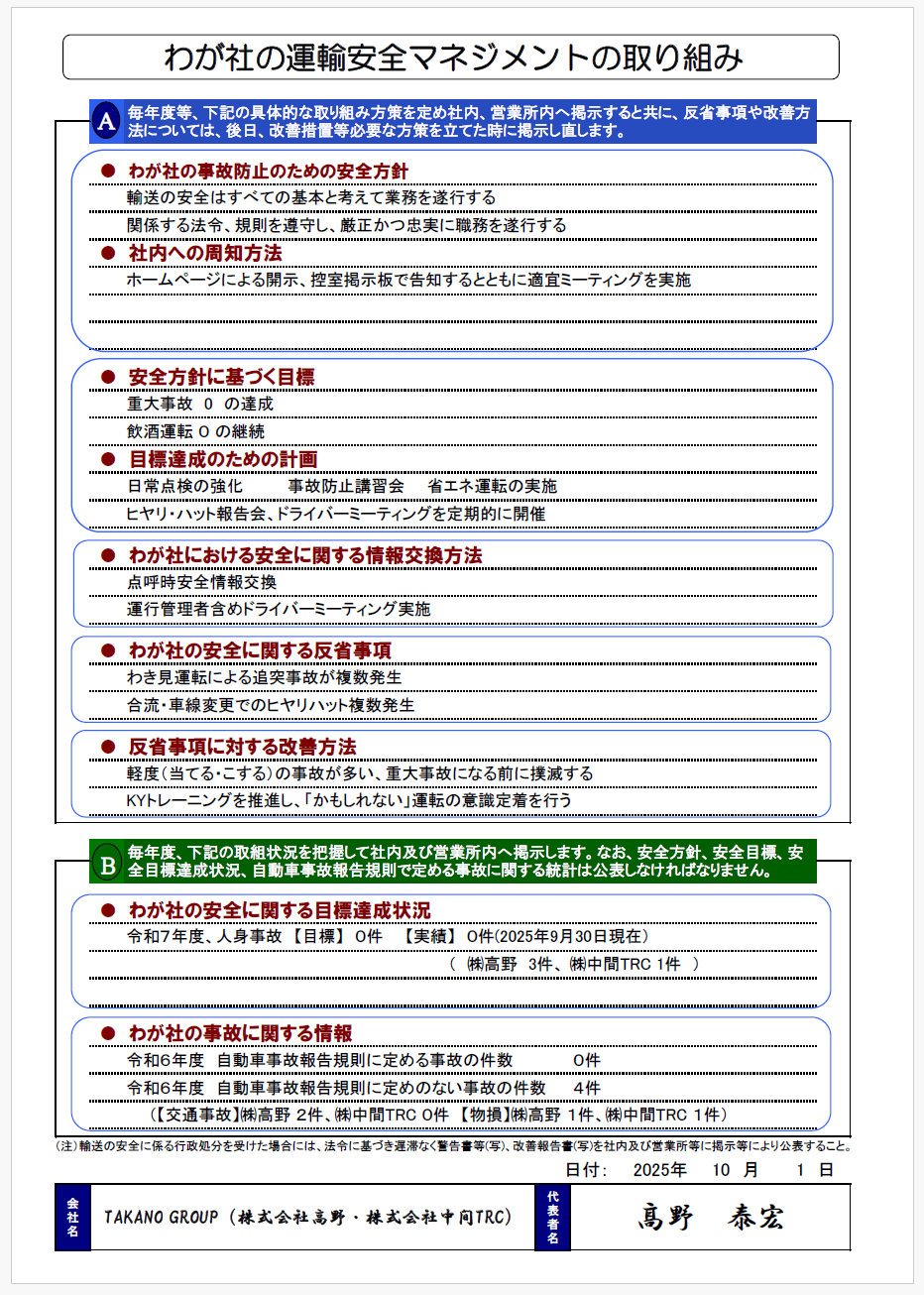 高野グループ令和7年度の運輸安全マネジメントを策定、ここに公表いたします。タカノグループ従業員が一丸となって、輸送の安全を確保するため、わが社の運輸安全マネジメントの取り組んで参ります。
